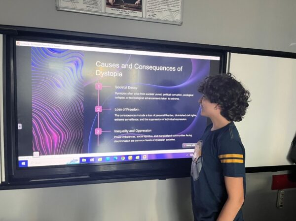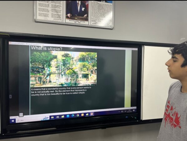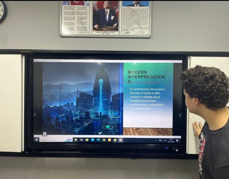 Eral Güzelyalı Anadolu Lisesi 9-B sınıfı öğrencilerimizin ütopya ve distopya hakkındaki hedef dil İngilizce sunumları, toplumla ilgili zıt vizyonların bir incelemesini sağladı. Her öğrenci, seçtikleri konseptin inceliklerini araştırdı ve potansiyel faydalar ve zararlara dair düşünceli analizler sundu. Sunumlar yalnızca edebi ve felsefi unsurların derinlemesine anlaşılmasını sergilemekle kalmadı, aynı zamanda ütopik ve distopik ideallerin gerçek dünyadaki etkileri hakkında eleştirel düşünmeyi de teşvik etti.
