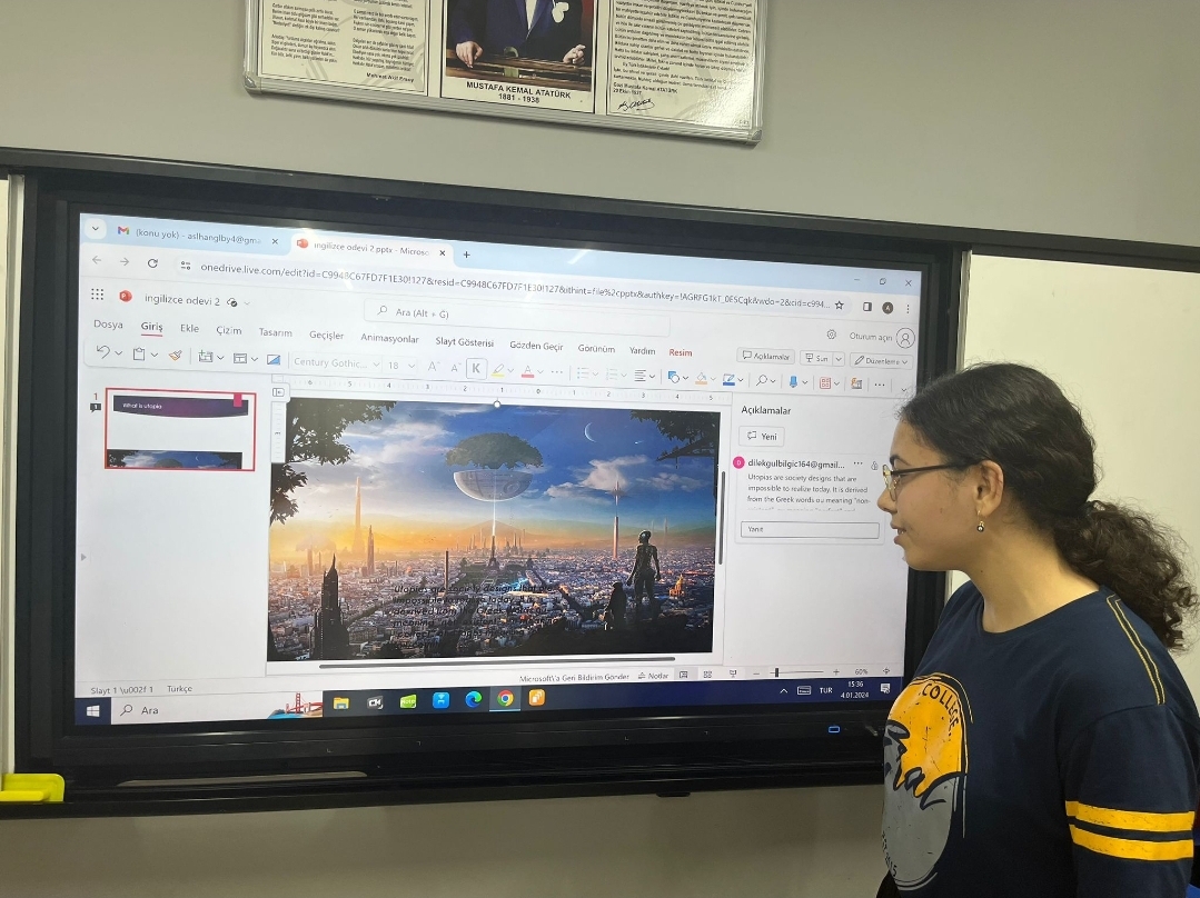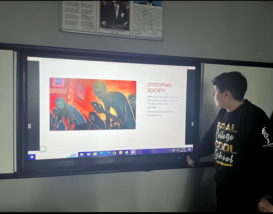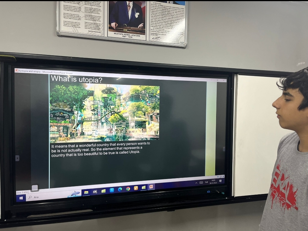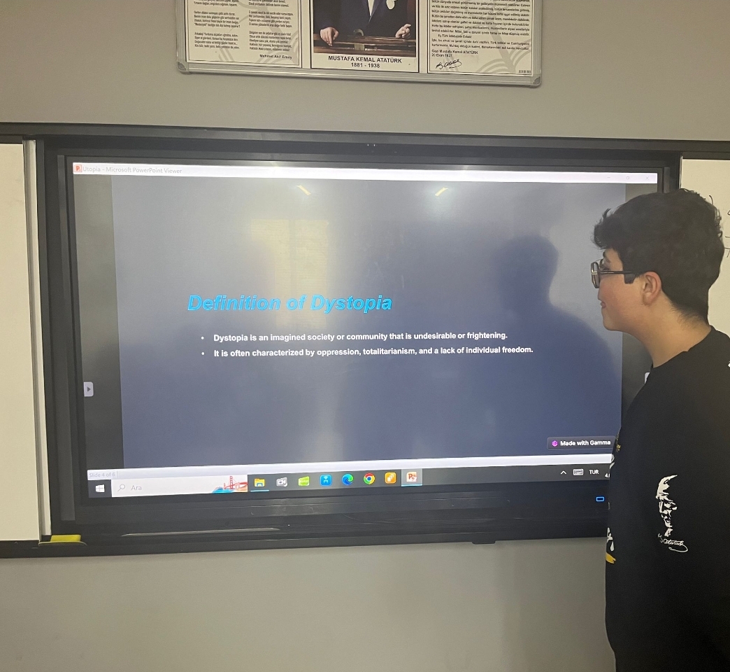 Eral Güzelyalı Anatolian Highschool 9-B class students' English presentations on utopia and dystopia provided a exploration of contrasting visions for society. Each group skillfully delved into the intricacies of their chosen concept, offering thoughtful analyses of the potential benefits and losses. The presentations not only showcased a deep understanding of literary and philosophical elements but also encouraged critical thinking about the implications of utopian and dystopian ideals in the real world.